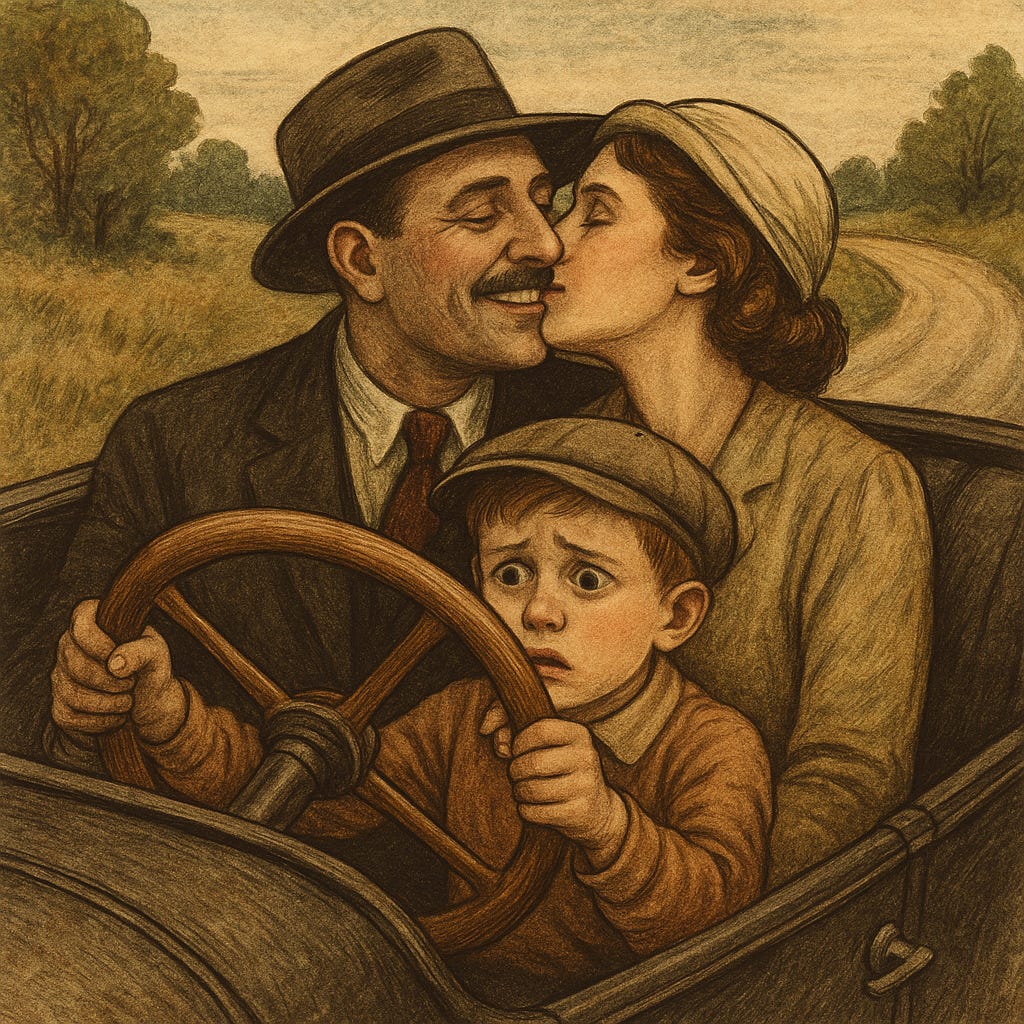 My day at the wheel began on a Saturday afternoon.. Fred asked to take Julia for a drive in the country and mother said, “fine and take your brother with you, Julia. “There must have been silent groans at the thought of a five-year-old chaperon. Anyway so we set off, meandering slowly along country roads. There’s something about having a little brother along when your boyfriend wants a kiss. Fred had an answer. He put me on his lap and said, “Now you steer the car. Keep it on this side of the road.” This sounds dangerous, but one must realize there were relatively few cars on rural byways in those days. We were creeping along an empty gravel road. I remember being frightened by having such a big task, but I was too timid to say no. The car had a large, stiff wooden steering wheel. Fred, meanwhile had turned his attention to Julia.