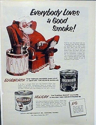 Most of you over the tender age of 35 can recall images of Santa with his pipe. Although currently out of vogue, I suspect pipes will have a resurgence of popularity someday – possibly to the extent that cigars had a decade ago. Pipe smoking was always regarded as a genteel pastime, a dignified pleasure enjoyed by men of worth who earned their lot in life and deserved the peaceful swirling bliss that only a well-packed pipe could deliver. People like your favorite grandpa, the tenacious sea captain, the entire English department faculty, or indeed – Santa Claus.