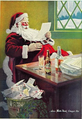Seven-year-old Annabelle walked through the living room and glanced at the back cover of her father’s “Field and Stream” that sat on the edge of the coffee table. She stopped, looked closer, and was shocked at the sight of Santa drinking the same funny-smelling juice that makes her daddy boil with rage, throw his shoes at the news reporter on the TV, and curse in his sleep. Annabelle was lost as she tried to decide whether her discovery made daddy’s actions acceptable, or Santa’s actions objectionable. Certainly these two worlds could not exist within such a small universe. She picked up the magazine and thought about asking daddy about the ad, but remembered that by this point of the evening he’s halfway through another bottle and she could already hear Walter Cronkite’s voice escaping from the den. Her mom would have an answer, and luckily she was easy to find. Annabelle followed the pungent scent of Chesterfields to the small parlor off the kitchen. She could hear the “chink” of her mom’s cigarette lighter from the hallway, and as she approached the parlor, the air grew thick and grey.