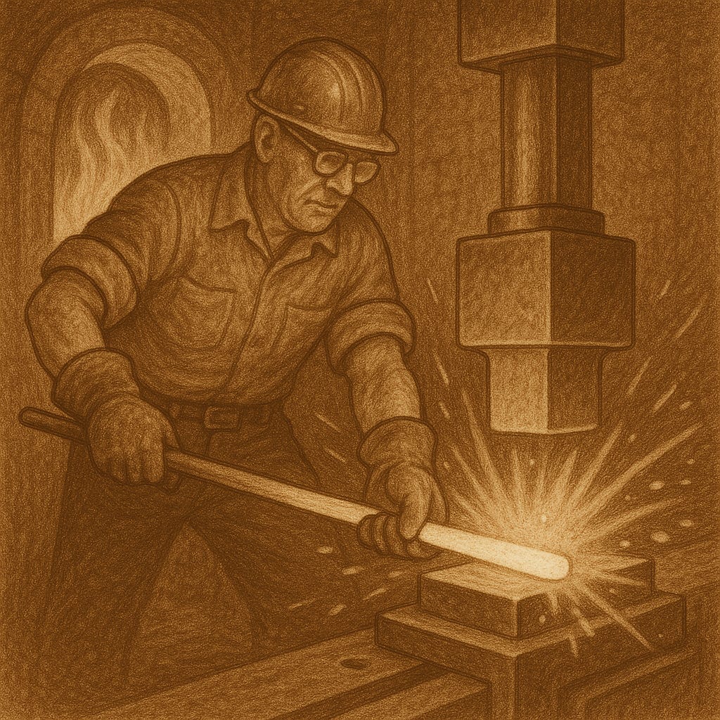 He worked before a great furnace. He fed long steel rods into the furnace where they reached 2000 degrees and the ends became white hot. Then with heavy gloves he would manhandle a rod over to the drop forge and lay it on a die.
